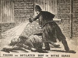 found by a beat cop in the corner of Mitre Square. Her throat had been cut, her face disfigured, her abdomen