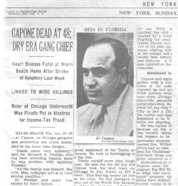 suffered a stroke. The next day, January 22, 1947 Al Capone suffered a fatal heart attack and died.