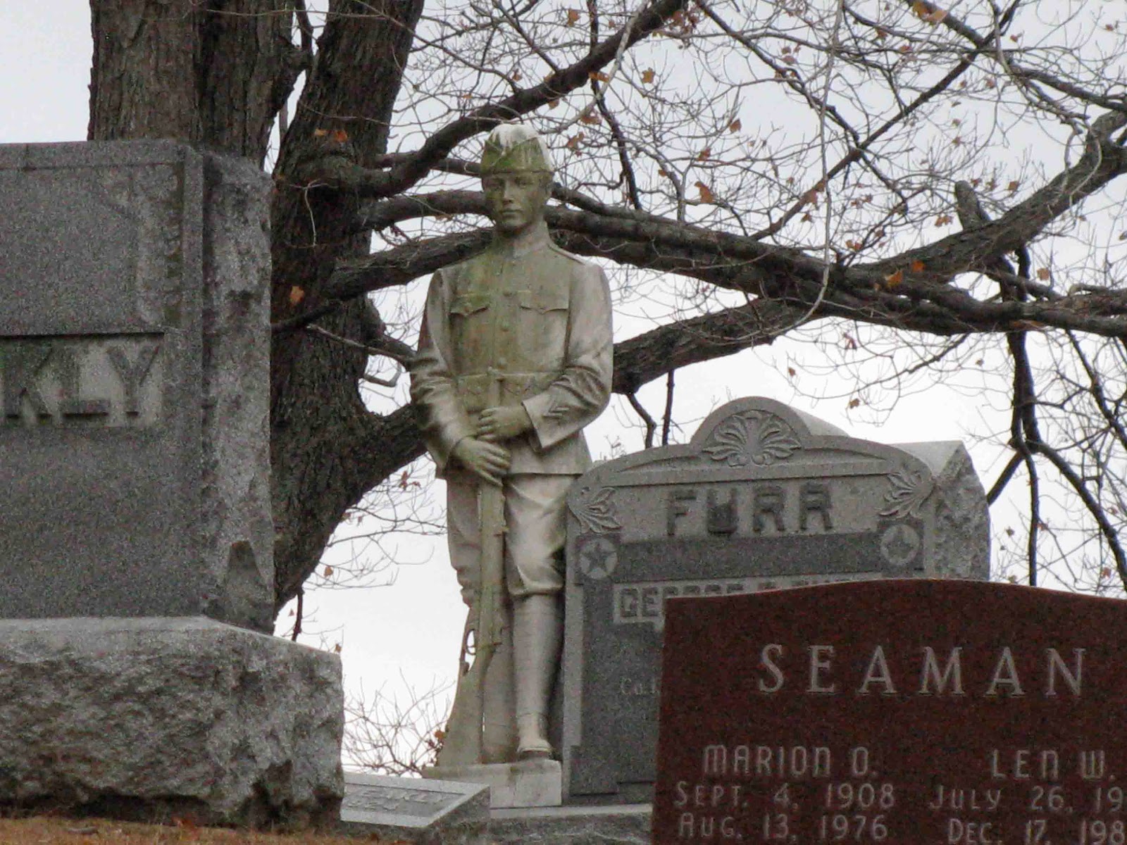 Be aware that when wandering the cemetery, you may be caught off-guard by the gaze of a WWI soldier, standing at ease on a hilltop. Carved in Italy from white cara marble, this sculpture is the exact likeness of the young soldier named George F. Furr who lies buried beneath. On his stone is the notation: Co. 1 53rd U.S. INF 4th Div.