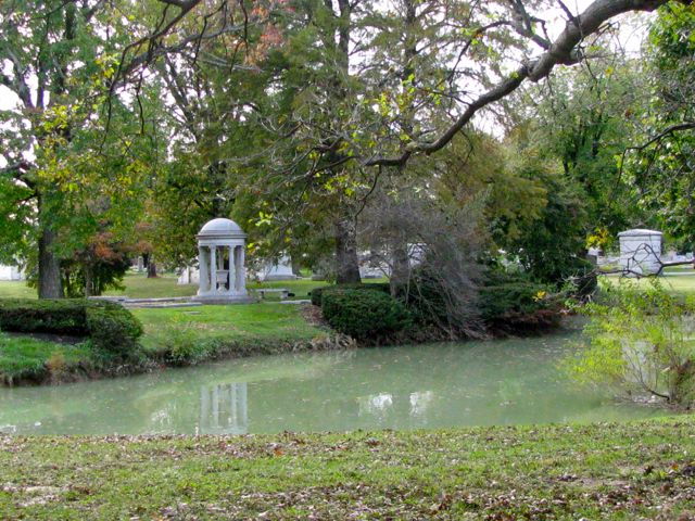Alarge man-made lake is on the grounds, surrounded by mausoleums crafted from