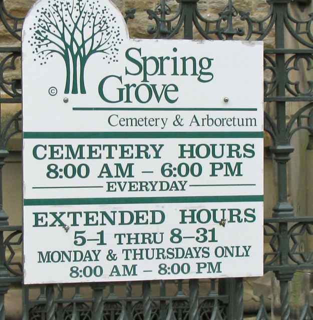 Spring Grove is located at 4521 Spring Grove Avenue in Cincinnati. The cemetery grounds are open from 8 A.M. to 6 P.M. each day. The phone number is (513) 681-7526. Visit their web page at
