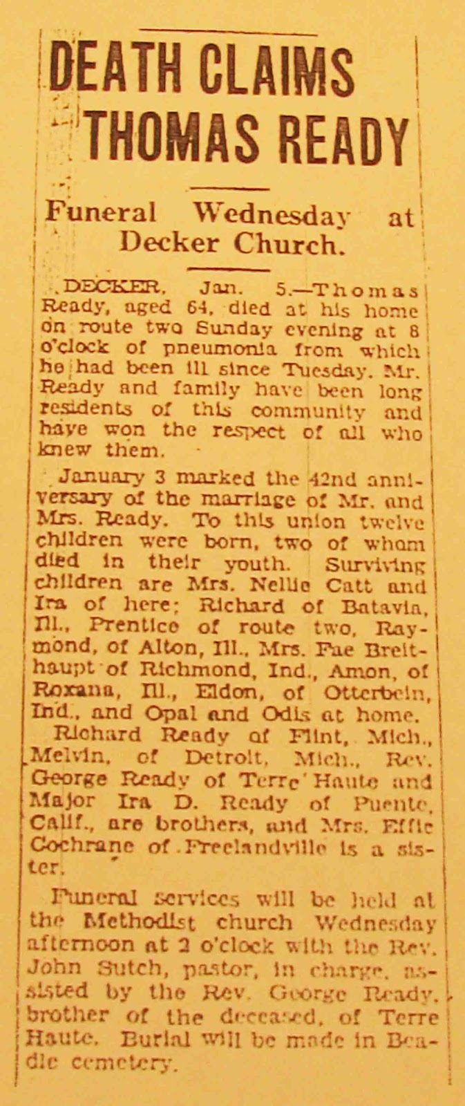 When we explored death certificates and death records on Tuesday, I failed to mention that the funeral director is the person responsible for getting this certificate filled out and filed. He or she is the person who will talk with the informant of the deceased in order to gather the required data for the certificate. The funeral director is also the person who writes and places the obituaries with the media. Parts of an obit may include a listing of surviving relatives consisting of the spouse, children by name and their spouses, grandchildren and their spouses and great-grandchildren, along with siblings. Those who have already passed may also be mentioned. The deceased’s age, address, occupation, religious affiliation, military service, memberships, education, accomplishments and hobbies may also be written up in an obit. Those residents with more community prominence will usually have obits that contain more information. Details regarding the funeral service, where it is being held and the burial location are also included in an obit.