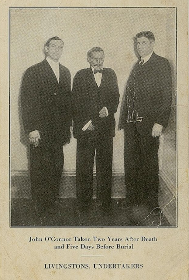 post mortem photo was taken two year after death and used to try and locate the man’s relatives. (And apparently, also an advertisement for Livingstons, Undertakers.)