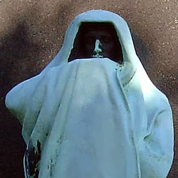 Themysterious, hooded and draped figure can be found sitting or standing in front