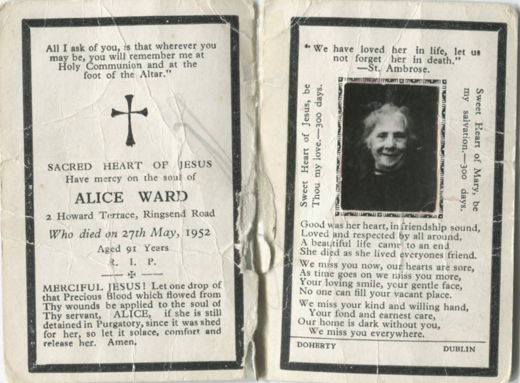 with a scene on the front, and the deceased’s name and information printed inside. As this type of card became popular, all four sides contained information about the deceased, and included poems, photos, and artwork.