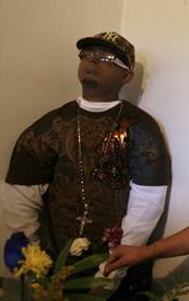 posed standing in her living room during his three-day wake.