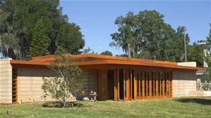 base topped with sloping roofs, and long windows that let in nature. Wright’s