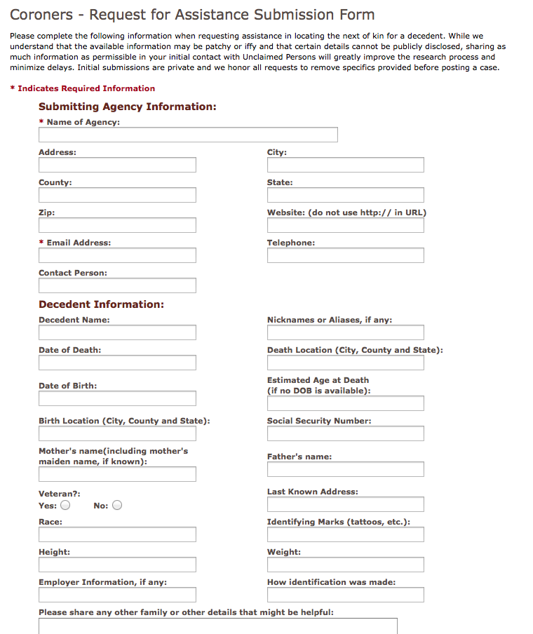 A coroner’s office will send information to Unclaimed Persons. A submission