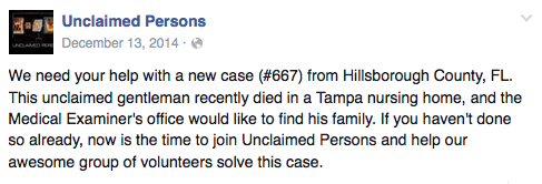 violating anyone’s privacy) with the Unclaimed Persons group.