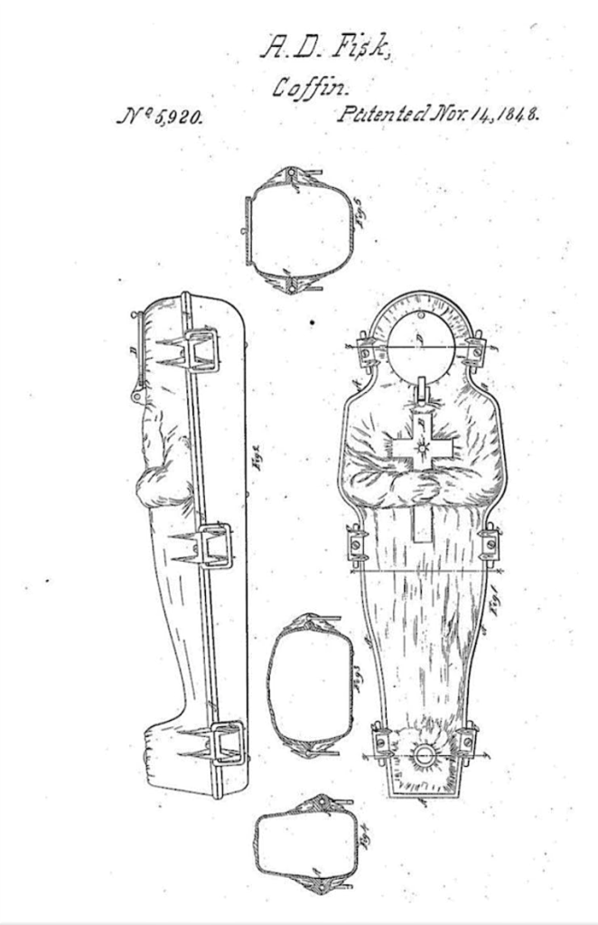 By the mid-1840s, Fisk had developed an airtight metallic burial container, and on November 14, 1848, he received a patent for his cast-iron coffin.