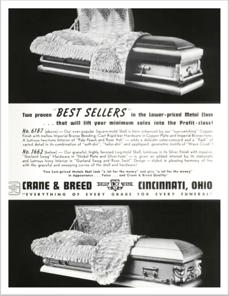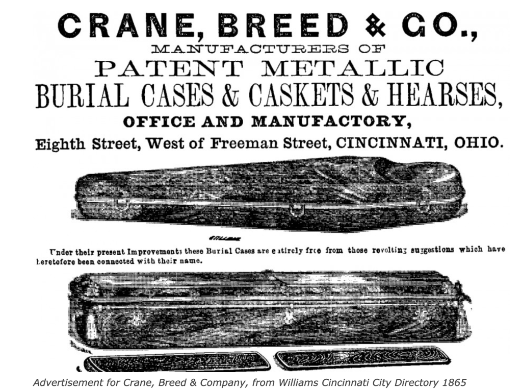During the twentieth century, Crane & Breed introduced a stainless steel casket. The company went out of business in 1977, making it the longest-operating casket manufacturer in Cincinnati.
