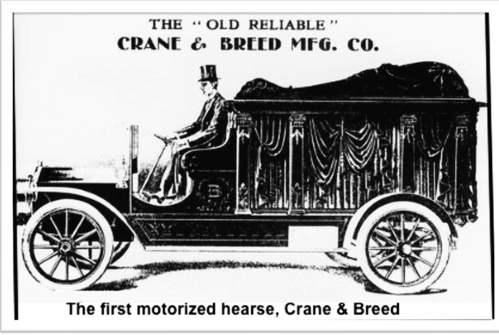 Crane & Breed went on to manufacture hearses, funeral coaches, and ambulances during the early 1900s, releasing the first gasoline-powered hearse in 1909. From 1912 to 1917, Crane & Breed produced custom hearses and ambulances. The hearses were known for deeply polished wood, distinctive bodies, ornate hardware, and glass-sided compartments.