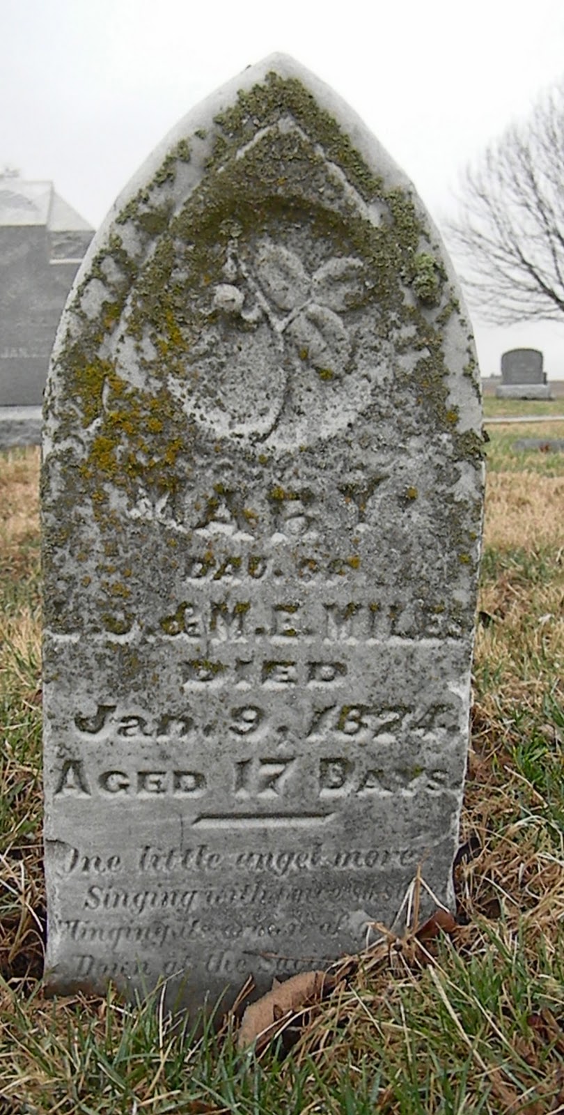 ‘Mary dau. (daughter) of L.J. & M.E. Miles’ had a more detailed stone. Mary’s death date and age were listed, along with the symbol of a rosebud, used to indicate the lose of a young life.